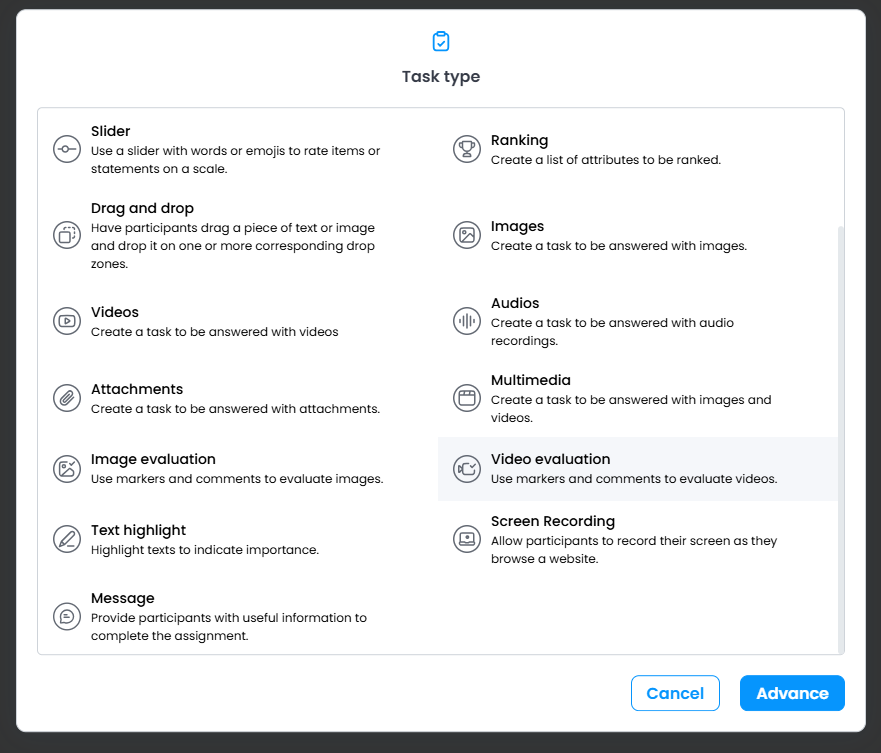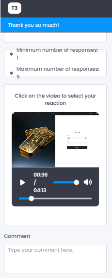 Video Evaluation is a type of task that presents the participant with a video to be evaluated on a scale and marked with reaction labels.