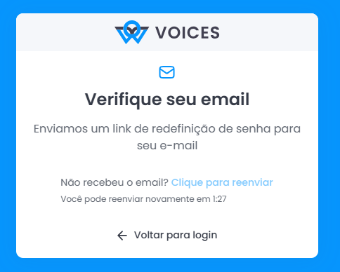 Caso não receba o e-mail imediatamente, aguarde aproximadamente 2 minutos e utilize a opção “Clique para reenviar” para solicitar um novo envio.