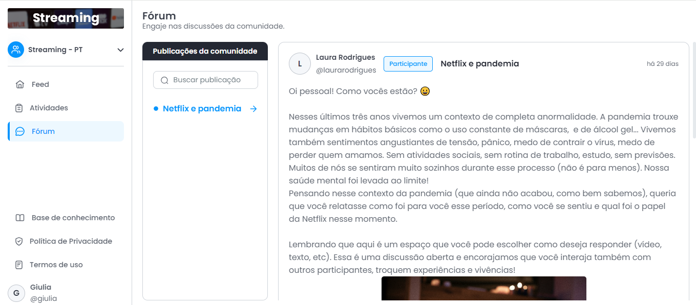 Após ter sua conta criada, você será designado a participar de atividades e responder tarefas desenvolvidas pelos criadores do estudo e participar do fórum. Você também poderá utilizar o chat para se comunicar com o(s) moderador(es) e administrador(es) da comunidade quando eles entrarem em contato - as conversas ocorrem em tempo real.